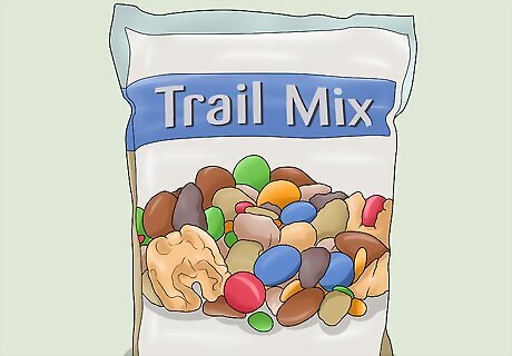 Carry high-energy, salty snacks. You'll be sweating, so you'll need plenty of salt to refuel. Plus, you'll need food with carbohydrates, fat, and protein to keep you going on your hike. Remember, you'll need more to eat than you normally would at home, so plan ahead. For instance, trail mix is a good option, since it's full of protein and fat (nuts) and high-energy carbohydrates (dried fruit), plus salt. You could also try granola bars, fresh fruit, beef jerky, and even sports drinks.