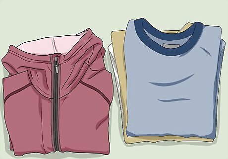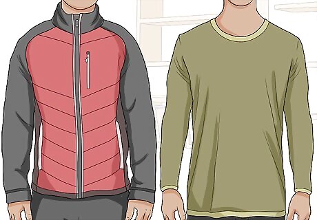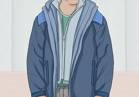 Wear several layers of clothes on top and bottom. Wearing layers provide insulation; put on at least 3 layers. When picking the layer next to your skin, make sure it wicks away moisture so the dampness won't cool you down. On top of that, wear layers that insulate your body, such as wool or fleece. Then, on the outside, make sure you have a coat on that blocks moisture; try to find one with a hood you can pull up. Have a bottom layer that is breathable, but provides some level of warmth and then all of your other layers should be waterproof. Wool or high-tech polyester are good choices for the bottom layer, as they move moisture away from your skin. The middle layer should be the bulkiest, such as insulated fleece or a goose down jacket. Avoid wearing cotton, as it retains moisture rather than moving it away from your skin.