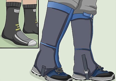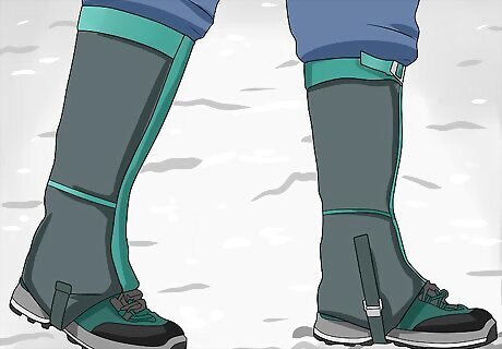 Opt for insulated hiking boots, warm socks, and gaiters. Your hiking boots should be made for cold weather so they provide insulation against the cold. Also, make sure to pick warm socks that wick away moisture, such as ones made out of wool. Gaiters provide extra protection for your legs against the cold, too. Consider wearing 2 pairs of socks, a thin layer with wicking material and then a thicker wool pair. Gaiters fit over your calves and ankles. You wear them over your boots and pants, and they keep snow from getting in. Also, put traction devices on your boots if they aren't already equipped for the ice! These devices stretch over the bottom of your boot and give you spikes to dig into the slippery patches.