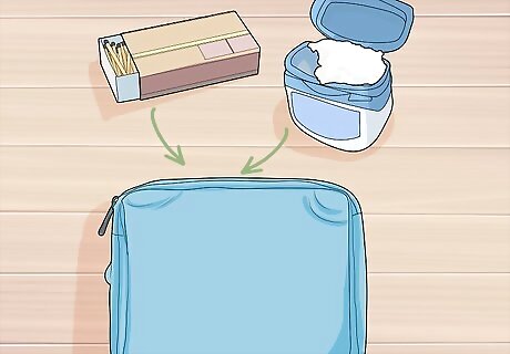 Carry fire-making supplies. While you shouldn't rely solely on a campfire to keep you warm if you're caught in the snow, it can be helpful for warmth and heating water. Have a small hand shovel to clear the snow, as well as a lighter or matches to start a fire. You should also have fire-starters on you so you don't have to find them in the damp ground. Fire starters can include dryer lint or cotton balls dipped in petroleum jelly, just to name a few. Keep them in a zip-top bag. Also, keep the lighter or matches in a waterproof bag so they don't get wet.