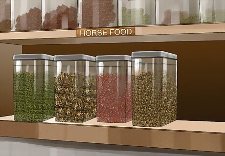 Store food properly so that small animals can’t access it. Small animals can also get into your horse’s food. If they die, they’ll decompose and release toxins. This infects your horse’s food. Take steps to secure the food by keeping the storage area clean, blocking holes and cracks, and choosing sturdy containers. Check the food containers weekly to make sure that there are no holes or tears caused by rodents. Before you put out feed, make sure that it is free of rodent droppings. Ask your feed store about rodent-proof containers, which can help protect your horse’s food. If you see a rodent or other animal in your horse’s food, especially if it’s dead, throw that feed away. Do NOT give your horse potentially infected feed. If the container is reusable, disinfect it with a 10% bleach solution. Rinse it twice.