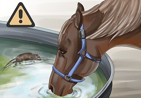 Check your horse’s water supply daily for dead animals. When dead animals decay, they can release botulism toxins. Small animals like rodents are attracted to your horse’s water, so it’s important that you inspect it often to keep it clean. It's best to check 1 or 2 times per day. If you find a dead animal, you should remove it, drain the water, and disinfect the container. To disinfect the container, wash it with a 10% bleach solution. Rinse it twice before refilling it with water. Place a board in the water so that small animals can climb onto it if they fall in the water. They are not harmful to the horse unless they die in the water.