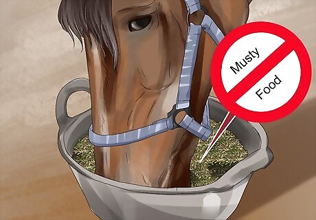 Avoid feeding your horse moist or musty food. The bacteria that causes botulism flourishes in moist, damp environments. This means that food that has gotten wet or has been kept in wet conditions can allow the bacteria to grow. Feeding your horse this contaminated food could cause an infection. Don’t feed your horse haylage, as it is moist. You can keep your food dry by properly storing it in an area that is off the ground and protected from the weather. It's best to store the food in air-tight, rodent-proof containers whenever possible.