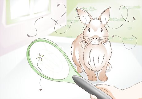 Repel flies. Do your best to eliminate flies around the rabbit. Invest in a fly zapper, a blue light that attracts flies and then kills them. Alternatively use sticky fly papers, and also keep the rabbit's home clear of food debris that might attract these insects. Some herbs are said to have fly repellent properties, so consider growing them beside an outdoor hutch or in pots inside. These include chamomile, peppermint, basil, green oregano, hemp, lavender, rosemary and rue.