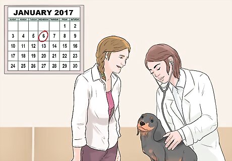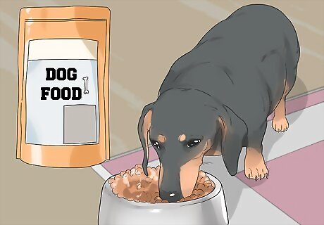 Feed her properly. Throughout her pregnancy, it's important to feed the dog a high quality dog food, with about a third protein and 17 percent fat. It should provide about 1 to 1.8 percent calcium and 0.8 to 1.6 percent phosphorous to help her develop milk later. Ideally, the carbohydrates in the food should be low in fiber to make them more easily digestible. Similarly, the protein should be one that's easy to digest. Often, a puppy food has the right balance, such as Hill's Science Diet Puppy Food; however, don't use a large breed formula. Often a food labelled "performance" or "active" will be a good choice. Slowly increase the amount of food she receives throughout her pregnancy. By about 5 weeks, she should have about 10 percent more, and by the time she is giving birth, she should have 15 to 25 percent more than she normally does.