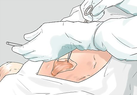 Provide assistance if needed. You may need to give your dog assistance if she's having trouble, particularly if you can see a puppy's head that seems stuck. If she's been straining (having contractions every few minutes) for more than thirty minutes, you can see if you can help her get the puppy out. Put on latex gloves first, and then find a lubricant like KY Jelly. Rub it on your fingertips. Check the dog's vulva for a puppy's head. Stick your fingers in, rubbing the lubricant around the puppy's head. Grasp the puppy, and move it back and forth to help it come out. You can also use a catheter-tipped syringe with some lubricant if your fingers won't fit. You can also wrap a piece of tissue or washcloth around the puppy's head to help gently pull it out.