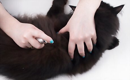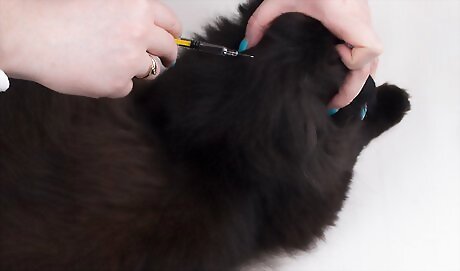 Rinse your cat with a dip treatment once a month. Apply the rinse in a well ventilated area and according to the specific directions given by the manufacturer and your veterinarian. These are a little less common and will involve soaking the entire cat. If your cat isn’t cooperative with bathing, then you probably want to avoid this method and try the collar or topical method. Avoid getting the flea and tick rinse in the cat’s eyes or ears. You may want to put cotton balls in the cat’s ears and ophthalmic ointment (eye ointment) in the eyes for irritation just in case. There may be excess residue from the rinse so clean your hands and surrounding area thoroughly.