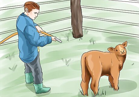 Keep the calves clean. Hygiene is just as important to calves as it is to humans. This means keeping their living area as clean as possible, involving such practices as putting out new bedding, or separating their eating space from their resting space. Though washing calves is not commonly practiced nor necessary, if they have excessive "tag" (poop on the hide) then it may be a good idea to do so. Remember, the tamer and calmer the calf, the less stress it is to wash them. Also remember, wash only if it's necessary, not when you want to. Rain for the older calves can give them a good bathing too. Clean the barn or bedding area is not fun, but somebody has to do it. All you have to have is a pitchfork ($12 to $20/ prices vary), shovel ($10 to $20/prices may vary), wheelbarrow ($60 to $230/prices may vary), old work clothes (coveralls, jeans, old T-shirt are ideal), and rubber boots ($30 to $40/prices may vary).