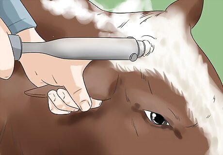Consider dehorning your calf if it is growing buds or has horns already. Your calf will grow into an adult animal eventually, and horns can be quite dangerous even if the animal doesn't mean to hurt you. One flick of the bovine's head and you could end up in hospital or worse. Please consider your own safety--and even the other animals on the farm--if you think that dehorning is "too cruel" to perform on a calf. You can usually tell if there are some buds growing on either side of the top of the calf's head or poll (near the ears) by the way the hair is growing. Catching the calf to have a feel can give you a good indication that the calf you have is horned. If there are no buds present, this means that you have a hornless or polled calf--this is nothing to be worried about, as it is completely natural for cattle to have no horns. There are several options to removing horns available: Burning: You can use a branding iron or an electric dehorner to take off the small horns. All you have to do is hold the calf down and burn the horns down to a nub to where they can't grow anymore. (You may need someone to help you hold the calf down, because the burning can be painful for the calf and the calf will put up a huge struggle to get away.) Note: burning is best for calves who have the start of hard horns, not soft buds. If the calf has soft buds, caustic paste is best. Dehorning paste: Dehorning or caustic paste is a highly corrosive substance that essentially "burns" the buds off by a chemical reaction between the skin of the horn buds and the paste itself. Though effective, it can be irritating for the calf as it may get the calf to start itching at the buds at its head. Make sure you get the paste only on the horns buds and not anywhere else on the calf. The calf will need to be restrained during the process. Cutting: A dehorning "scooper" is a tool that is used to cut the horns right out of the base of the calf's head. This method is a bit more gory and bloody than the other two above, so proper restraint and possibly local anaesthesia may need to be considered before using this dehorning method.