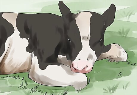 Watch out for sickness and diseases. It's not a matter of if your calves will get sick, but when. Unusual behavior is the best indicator for illness in a calf. Symptoms such as coughing, ragged breathing, scouring (diarrhea), constipated, foaming/frothing at the mouth (usually not an indicator of rabies), refusing to get up, runny or snotty nose, appearing lame, generally looks more interested in resting and sleeping (listless) than actively playing, among other possibilities, are all indicators that mean you should call your veterinarian right away. If your calves develop a scaly, hairless circular pattern on its skin, this is the start of what is called "ringworm." It is not a sickness by any means, but merely a fungal infection of the skin that does nothing for the calf except make him particularly itchy. Ringworm is contagious to humans, so be careful when handling the affected calf. Ringworm only comes around in the cold, dry parts of the year, and soon disappears in a few months. Iodine solution, though, will help clear up the skin affliction.