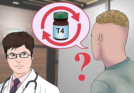 Follow up to see if you need medicine changes. At first, you may need to increase your dosage of T4 based on symptoms. Every time your doctor increases your dosage of T4, you need a blood test 6 to 10 weeks afterward in order to ensure that your T4 levels are normal. Eventually you and your doctor will feel comfortable about the dosage you’re taking, and you can get your T4 levels checked only once a year. Babies and young children must strictly maintain their medication regimes or risk intellectual/developmental disability and stunted growth.