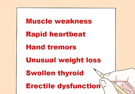 When looking for evidence of this condition, watch for notable symptoms, such as protruding and irritated eyes or muscle weakness. If you notice symptoms, talk to a doctor, who can run tests to diagnose this condition.[2]
