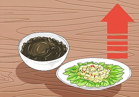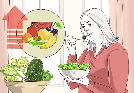 Increase your intake of fruits and vegetables. Fruits and vegetables are very important food groups to maintain your overall health and reduce your risk of developing dementia. Fruits and vegetables are low in calories, but high in vitamins, minerals and most importantly antioxidants. Studies have shown that a variety of the antioxidants present in fruits and vegetables have a protective like quality to the brain. Aim for five to nine servings daily. Including one to two servings per meal will help you reach this goal. Measure out 1 cup of vegetables, 2 cups of salad greens and 1/2 cup of fruit. One vegetable in particular that has been linked to decreased risk of dementia is spinach. This leafy green has been shown to prevent the buildup of plaques in the brain and is also high in folic acid and iron. Berries high in flavonoids, such as blueberries and strawberries, have been associated with slower rates of cognitive decline. Flavonoids are believed to have anti-inflammatory and antioxidant properties that may have a protective effect against dementia.