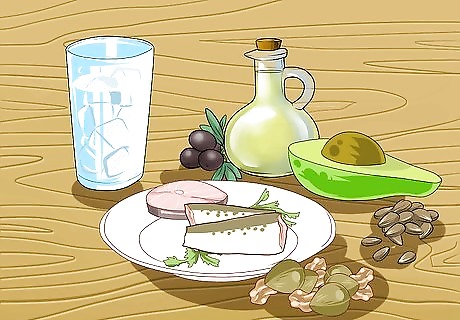 Include healthy fats daily. A specific nutrient that has been associated with decreased risk of dementia are healthy fats, such as Omega-3 fatty acids, polyunsaturated, and monounsaturated fats. Studies have shown that heart healthy fats like Omega-3 fats reduce the risk of heart disease and stroke which are linked to dementia. These heart-healthy fats are found in a wide variety of foods like: nuts; seeds; cold-water fish like salmon, tuna and mackerel; avocado; olive oil; olives; and canola oil. Almonds are also high in healthy fats and have been specifically linked to a reduced risk of dementia. If you're choosing nuts, go for a 1/4 cup almonds. Have them alone as a snack, mixed into a trail mix or sprinkled into your morning oatmeal or yogurt.