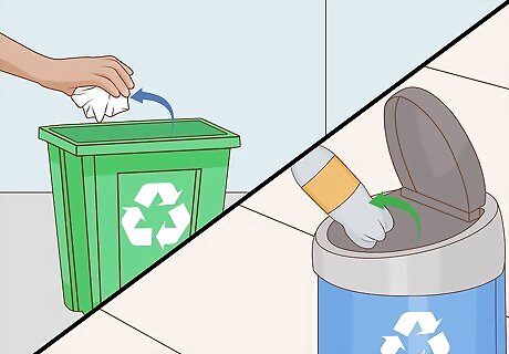 Recycle all recyclable materials. Recycling paper, plastic, glass, and other items can reduce your energy consumption significantly. Set up recycling bins in your home and office to encourage others to recycle rather than trash their items. Add recycling pickup to your trash service if you don’t already have it. You can also recycle things like plastic bottles into craft projects, such as coin purses. The recycling rules will vary from city to city, so check with your city. Some places require you to sort items while others do not.