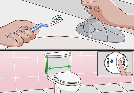 Reduce your water usage. Saving water also reduces the amount of energy needed to purify or heat it. Limit your shower time and turn off the faucet when brushing your teeth. You can also make sure to wash only full loads of laundry and dishes in order to save water and energy used to heat the water. Installing low-flush toilets and low-volume faucets will also dramatically reduce your water usage. Avoid pre-washing your dishes before you put them in the dishwasher. Limit the amount of time sprinklers are on, and make sure to only water grassy areas, rather than overspraying onto sidewalks or parking lots.
