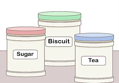 Store food in your canisters. If your canisters come with tops, you may be able to store food in them. To do this, make sure you've cleaned the canister. In addition, verify that it's not rusting or has paint flakes. Afterwards, fill your canister with the food of your choice. Some foods that are suited for canisters include baking supplies (flour, sugar, or salt) or snacks (cookies, crackers, and chips). Consider placing labels on the canisters to mark what they contain. You can do this by stenciling chalk or by creating fabric or paper labels.