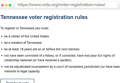 Check that there are no legal reasons you can't vote. If you are a convicted felon, you will need to complete your sentence, probation, and parole before you are eligible to vote. The court can also rule individuals mentally incapacitated without the right to vote. If you try to register and are found ineligible to vote for any of these reasons, you can be fined up to $2000 or imprisoned for up to 180 days. Don't worry if you make an honest mistake. This law is in place to catch people who are deliberately cheating.