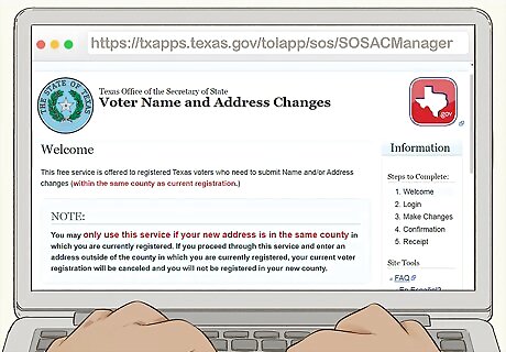 Notify the registrar if you moved within your county. If you have moved within the same county since the last time you voted, you need to update your address with the Registrar. Correct your address on your voter registration certificate and send it to your county's voter registrar. Or fill out a new voter registration application and choose "change" under application type. Alternatively, you can fill out the form at https://txapps.texas.gov/tolapp/sos/SOSACManager Even if you just moved down the street, your precinct may have changed.