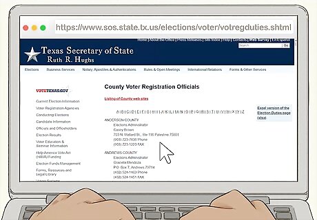 Find your local Voter Registrar office. Each county has an office that registers voters. Usually the Tax Assessor-Collector registers voters, but some counties have an Elections Administrator or the County Clerk to register voters. Check your county's office at https://www.sos.state.tx.us/elections/voter/votregduties.shtml Each office will have different opening hours. Be sure to check ahead of time when the office will be open.