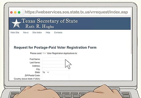 Request a postage-paid registration form to avoid paying postage. If you want to register by mail without paying for stamps, fill out the form at https://webservices.sos.state.tx.us/vrrequest/index.asp. Provide your name and address, and you will get an application in the mail. You can request multiple applications, if you would like to register up to 5 other voters in your household.