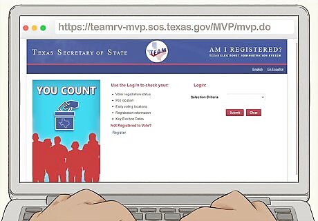 Find out if you have already registered to vote in Texas. Visit the Texas Secretary of State website at https://teamrv-mvp.sos.texas.gov/MVP/mvp.do . The website will also tell you where your polling place is for an upcoming election. The following are 3 ways to verify if you are a registered voter using the website: If you have your Voter Unique Identifier (VUID), which is on your voter registration certificate, choose "VUID, Date of Birth" from the Selection Criteria menu. Check with your driver's license number by choosing "TDL, Date of Birth" from the menu. Provide your full name, county, date of birth, and zip code by choosing "Name, County, Date of Birth" from the menu.