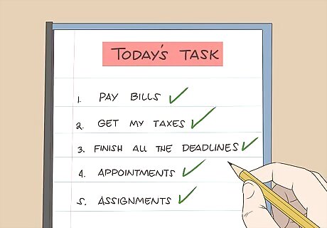 Confront changeable sources of anxiety. Sometimes anxiety stems from a feeling of being overwhelmed by a million little things you have to get done. Taken alone, each item on your to-do list may not be a big source of stress, but the compilation of a lot of small obligations can end up being an anxiety-inducing burden. Tackling issues you have the power to change one at a time can help you feel less anxious right away. Perform small but annoying tasks right away so they don't start accumulating. Pay your bills and parking tickets on time, get your taxes done well in advance, register for classes in plenty of time, keep your doctor and dentist appointments, and so on. You may have the power to change situations that seem out of your control if you approach them from a different angle. For example, if you're dreading a family reunion that's coming up, put a time limit on how long you're going to stay. Make sure your accommodations are comfortable. If taking these measures still doesn't stop feelings of extreme anxiety, you can always skip the event. You have control over how you spend your time.
