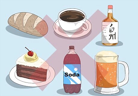 Stop eating and drinking items that lead to anxiety. You may be stoking the fire of your anxiety by ingesting stress-inducing foods on a regular basis. Limiting your intake of harmful foods and drinks can go a long way toward calming your mind and keeping your heart rate steady. Limit sugary and starchy foods. Most "comfort" food falls into the sugar or starch category, but these types of foods cause your blood sugar levels to spike and lead to greater anxiety. Drink less caffeine. Caffeine stimulates the nervous system, so reaching for that cup of coffee in the morning could be making you feel more anxious. Either stop drinking it altogether or limit yourself to one cup of coffee a day. Limit your alcohol intake. It's tempting to reach for alcohol when you just want to free your mind from stress. However, the temporary relief alcohol provides gives way to an increased state of anxiety. Alcohol is a depressant, so it can make your mood worse, and its effect on the body - dehydration, water retention, and negative long-term health effects - are anxiety-inducing on their own.