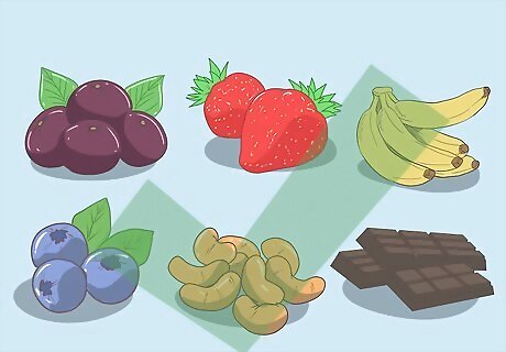 Incorporate mood-balancing foods into your diet. In addition to eating plenty of fruits and vegetables, whole grains, and lean meats to keep your body healthy, these foods give your mood an extra boost: Açaí berries, blueberries, and other foods high in antioxidants. Detoxifying your body can help reduce anxiety. Foods high in magnesium and potassium, natural stress reducers. Eat nuts, dark chocolate, and bananas.