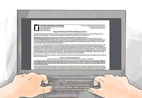 Download the renewal application. You may get a copy of the renewal application in the mail when the pharmacy board sends you notification that your license needs to be renewed. However, if you want to renew your license online you'll need to find the application on the pharmacy board's website. In some circumstances you may not be able to renew your license online. If this is your situation, look for a renewal application that you can download from the website and print, so you can fill it out and mail it to the board.