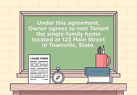 Provide a description of the property. The first part of a lease agreement typically describes the property that is being leased to the tenant. A street address is typically enough, although you might also describe the type of dwelling it is. For example, you might write "Under this agreement, Owner agrees to rent Tenant the single-family home located at 123 Main Street in Townville, State." If you're renting a single unit in a building or complex, include the unit number in your description as well.