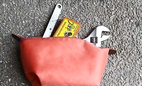 Prepare a travel bag containing all of the tools and equipment necessary to replace a blown inner tube. In order to assemble this bag, you must determine several things: The size of inner tube that the tire requires. This is often printed on the side of the inner tube or on the side of the tire itself. If you cannot find the size of the inner tube, consult your owner’s manual or manufacturer’s website. The type of valve your tube uses. This is either a Schrader valve or a Presta valve. Schrader valves are found on less expensive or older bikes, while Presta valves are often found on high end racing bikes. A Schrader valve is wider, and looks like the valve found on a car tire, while the Presta valve is much skinnier. The easiest way to determine what valve your inner tube uses is to consult your owner’s manual or manufacturer’s website. If you cannot find this information, ask a local bike shop employee. This information is critical in selecting the bike pump you will bring, because if the valve of the pump does not correspond to the valve of the tire, it will be impossible to inflate the inner tube. The size of wrench that is used to loosen the 4 nuts that hold your bicycle wheel’s axle in the frame. The measurements of these nuts can be found in the owner’s manual or manufacturer’s website. If you cannot find this information, a simple solution is to test out wrenches on the bolt until you find a wrench that is a snug fit to the nut. It is recommended that you bring a set of wrenches, ensuring you will have the right tools for the job. Make sure that if your bike uses metric nuts, you bring a metric set of wrenches and vice versa. A wrench is not necessary if both wheels are equipped with quick release levers.