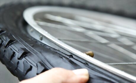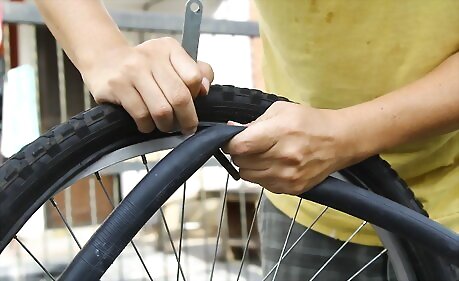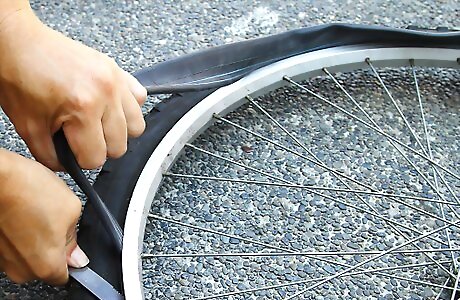 Push the tire back into the rim, being sure to match the valve of the inner tube with the valve hole cut into the rim. Without practice, this may be difficult to get the entire tire around the rim. Use the tire lever to assist you. If you are having a great deal of difficulty, ask a fellow biker, as having an extra set of hands can make this task much easier.