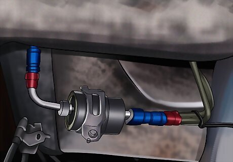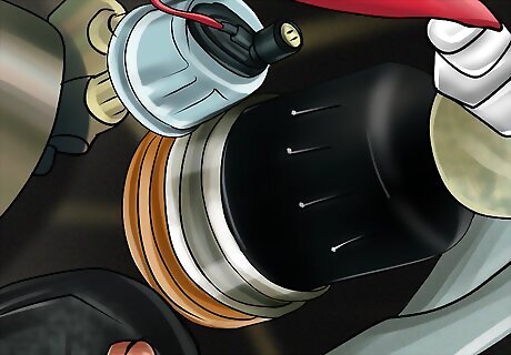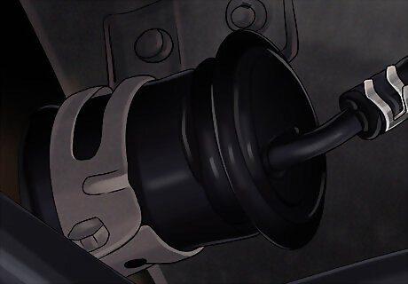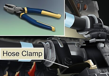 Use pliers to loosen the hose clamps attached to the fuel filter. Use a screwdriver to slide the fuel lines off. Clamp the rubber fuel lines with vise grips to prevent fuel from leaking before you slide the lines off the filter. Don't clamp the metal parts of the lines to avoid damage. Alternatively, plug the line with a pen or golf tee after you remove the rubber hoses.