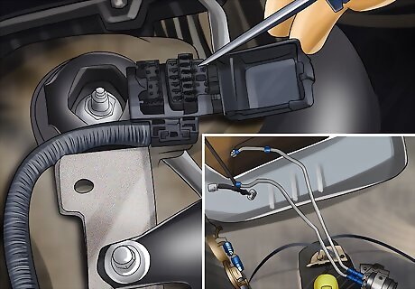Re-establish pressure in the fuel system by bridging the fuel pump (F/P) terminal to the ground terminal in the diagnostic connector under the hood. Put the ignition key in the on position, but don't start the car. This will allow the fuel pump to work without turning on the car, and the fuel line will repressurize. Turn off the key after 15 seconds and pull the wire from the diagnostic connector.