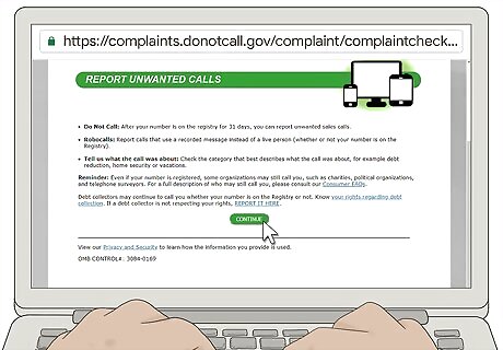 Report unwanted calls to the registry after 31 days. After your phone number has been registered for a month, unwanted telemarketing calls should cease. If you do happen to get an unwanted call, you can report it at https://complaints.donotcall.gov/complaint/complaintcheck.aspx. You can also report unwanted calls to the National Do Not Call Registry by calling 1-888-382-1222. Some organizations, such as charities, political organizations, and surveyors, may still call you after your number is registered.Tip: You can report robocalls to the National Do Not Call Registry regardless of whether or not your phone number is registered.