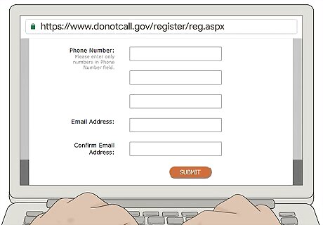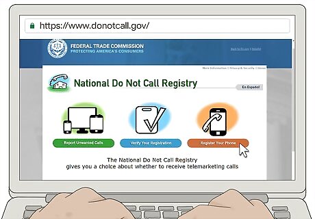 Go to the website of the National Do Not Call Registry. Putting your phone number on the National Do Not Call Registry will keep you from getting most telemarketing calls. Visit https://www.donotcall.gov/ and click "Register Your Phone" to get started. You can register mobile phone numbers and landlines on the registry. The registration doesn't expire, so if you've previously registered your phone, you don't have to register it again.Tip: If you're not sure whether your number is on the registry, click the "Verify Your Registration" link to find out.