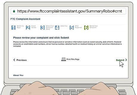 Review your complaint and submit it to the FTC. Before you submit your complaint you have the opportunity to review everything you've written. You can edit any part of your complaint or add to it if you remember more information that you think might be relevant. You may also want to print a copy of your complaint for your records. It may help to have the information all in one place in case you want to make a complaint to other agencies. You can also identify holes in your information that you may be able to fill in if the telemarketer happens to call you again.