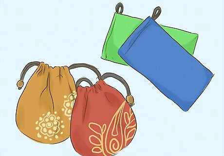 Create pouches or zip up bags for storing household items. This is a great way to turn an old saree into something functional and beautiful that you won't be embarrassed to leave lying about your home. You could even make multiple bags to give away to others as gifts. Use a drawstring to make a pouch, or sew in a zipper for a more secure closure. Types of Bags to Make: Coin purse Pencil Case Makeup pouch Eyeglass case