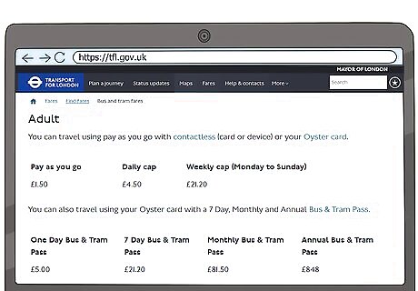 Buy a Travelcard if you plan on covering a lot of ground in a short period. Travelcards are sold at many of the same venues that carry Oyster cards, as well as online. Unlike an Oyster card, which charges you every time you take the bus, a Travelcard will allow you to make as many trips as you like within the timeframe of the plan you select. All you have to do is pick your preferred plan and make a one-time payment. In addition to day passes, which cost around £12.70 for a single adult, there are also 7-day, 1-month, 3-month, 6-month, and annual Travelcards available for passengers who plan on doing a lot of regular traveling. When you purchase a Travelcard, you’ll receive a paper ticket printed with the particulars of your chosen plan. Be sure to hold onto your ticket, as without it you won’t be admitted to any bus, Tube, tram, or railway.Warning: Paying for a Travelcard will typically end up costing you more than using an Oyster card or contactless payment method unless you make more than about 3 trips per day for the duration of your travel plan.