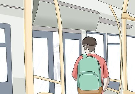Exit via the doors at the middle or rear of the bus once you arrive at your stop. When you hear the driver call out the name of your stop or see it appear on the overhead information screen, migrate to the back of the bus and be prepared to step off as soon as the doors open. Remember to disembark in an orderly fashion. You may have to wait for a few other passengers to clear out before its your turn to exit. There’s no need to touch out when you reach your destination. If you’re on a hail-and-ride bus, press one of the large red “Stop” buttons built into the handrails to request to be let off at any point along the way. Watch your step when getting off of the bus. The distance between the platform and the street or sidewalk isn’t especially high, but you could still lose your footing if you’re not careful.