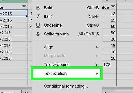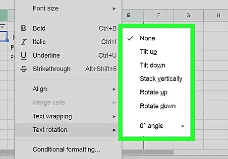Select a rotation angle. You can choose one of the directions listed, or click the angle menu to specify an angle in degrees. Once you make a selection, the text in the cell will transform to its new position. If you decide you don’t like the rotated cell value, click the Format menu, select Text rotation, then click None.