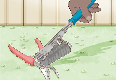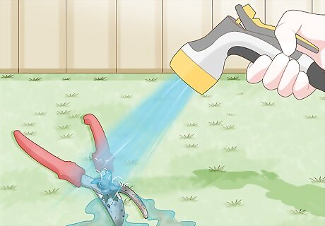 Spray your pruning shears with a garden hose to remove loose dirt. Before you sanitize your tools, you need to remove any stuck on dirt, leaves, or other debris from your last use. Use the spray nozzle on a garden hose to quickly blast the surface clean of loose dirt.