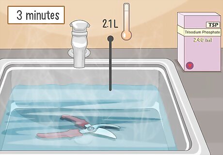Submerge infected shears in a trisodium phosphate (TSP) solution as an alternative to bleach. Sanitize your shears by soaking them for 3 minutes in a bucket or other basin filled with 1 c (240 ml) TSP and 9 cups (2.1 L) warm water. Like bleach, the TSP is very effective at killing bacteria on contact, so you don't need to scrub them afterwards. Protect your skin with gloves when using TSP because it can irritate your skin. You can find TSP at your local home improvement store. It is usually stored with deck or siding cleaning solutions.