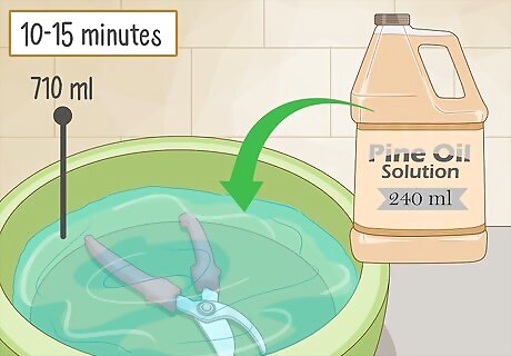 Soak pruning shears in a pine oil solution for less corrosive sanitation. Submerge shears in a basin filled with 1 c (240 ml) pine oil and 3 c (710 ml) water. After 10-15 minutes, you can remove and rinse them without any scrubbing. Pine oil is less corrosive than bleach, but also less effective. You can buy pine oil wherever you buy your household cleaning products.