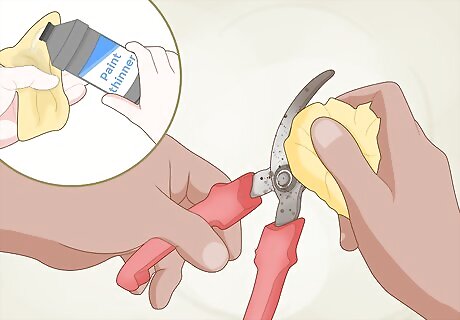 Remove remaining hardened sap with paint thinner or mineral spirits. Pour about 1 fl oz (30 ml) or paint thinner or mineral spirits directly from the container onto a clean rag. Then, vigorously rub the rag over the shears in small, circular motions to scrub off any remaining sticky and hardened sap. When using harsh chemicals like paint thinner or mineral spirits, wear disposable nitrile gloves to protect your skin from irritation.