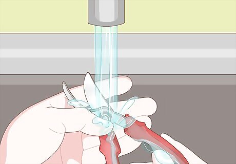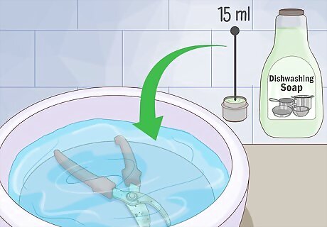 Wash the shears with warm water and dishwashing soap. Fill a washing tub or sink with warm water and about 1 US tbsp (15 ml) of dishwashing soap. Soak the shears in the soapy water for 10 minutes before using a sponge or clean rag to rub away stuck-on dirt or plant sap. Finally, rinse the shears well in clean water and dry them with a paper towel or clean rag. It's important to rinse and dry the shears well every time you get them wet to prevent corrosion.