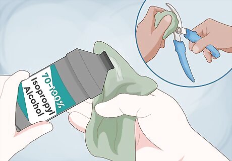 Wipe away small amounts of surface bacteria quickly with alcohol. Use 70-100% isopropyl alcohol or ethanol to quickly and conveniently kill off many spores and bacteria on your shears. Apply the alcohol directly from the container to a clean rag or alcohol wipes.Then, wipe the front and back of the blades with the alcohol, making sure to thoroughly clean any area that comes into contact with the plants. There is no need to rinse the shears after cleaning with alcohol. Keep a packet of alcohol wipes in your gardening tool kit for on-the-go sanitation.
