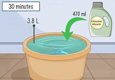 Disinfect shears with a chlorine bleach solution for thorough cleaning. Fill a washing tub or sink with 1 US gal (3.8 L) of water and mix in 2 c (470 ml) of chlorine bleach. Submerge the shears in the bleach solution and let them soak for 30 minutes. The bleach will do the job of cleaning them, so you don't need to scrub them after soaking. Wear gloves when using bleach to avoid skin irritation. Bleach is inexpensive and easy to find in the laundry or household cleaning section of grocery and home goods stores.