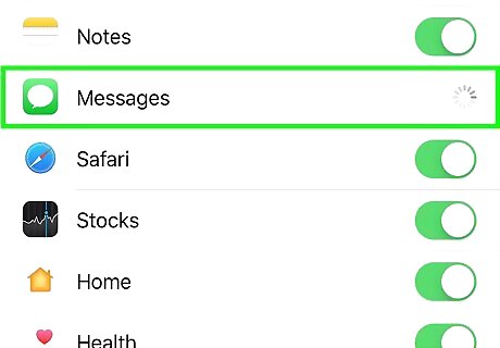 Tap the switch next to "Messages" to turn it on iPhone Switch On Icon. A green switch indicates that it is on and your messages are included in iCloud's storage. Your messages will sync across all your Apple devices (like the iPad, iPod Touch, and Mac), but they need to be plugged in, powered on, and connected to Wi-Fi for the initial sync. After the first time you enable Messages in iCloud, they will stay synced when your devices are connected to the internet.